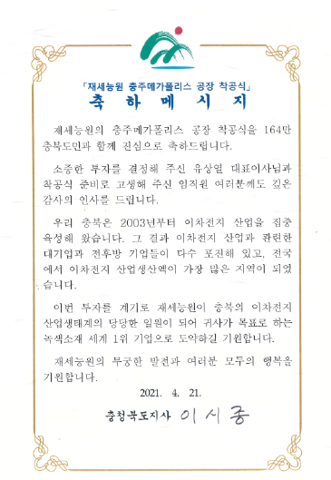 韓國(guó)忠清北道省長(zhǎng)發(fā)來(lái)賀詞:“忠清北道是韓國(guó)鋰電池生產(chǎn)總額最高的地區(qū),感謝容百選擇加入!衷心期待容百成為綠色材料的全球領(lǐng)先企業(yè)?!?/span>